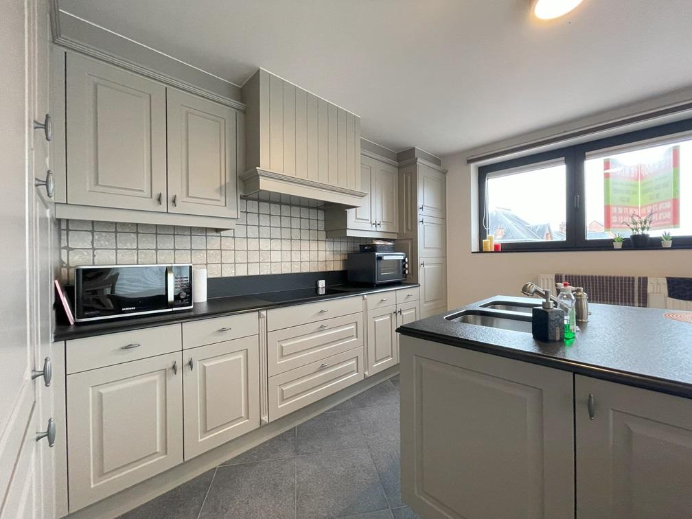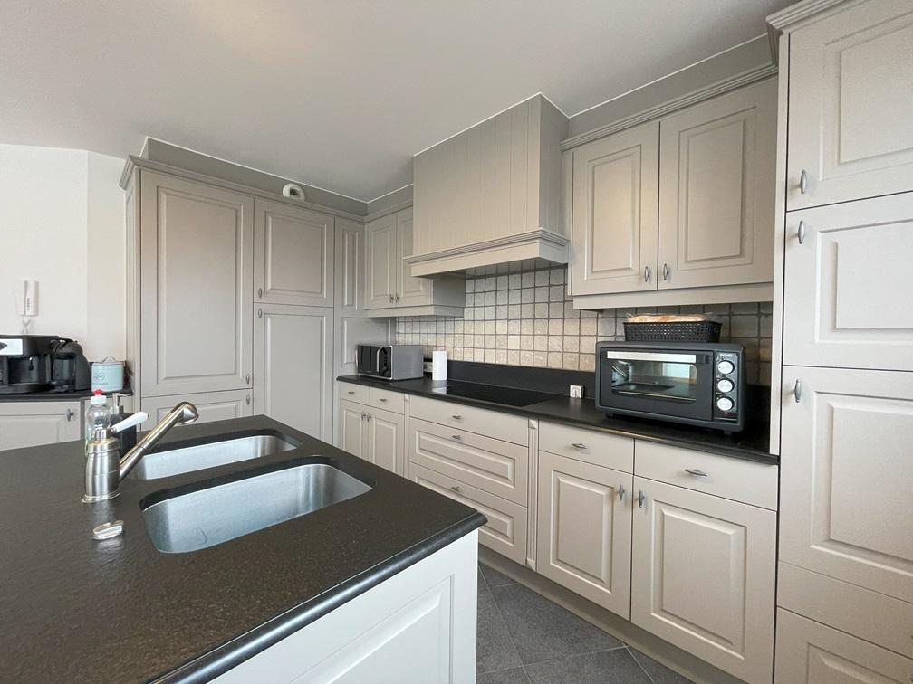 Het zeer ruime appartement voorziet o.a. in een hoogwaardige open keuken, ruime leefruimte, twee terrassen (vooraan en achteraan), twee ruime slaapkamers, prachtige badkamer met bad en douche en een aparte garages op de begane grond.