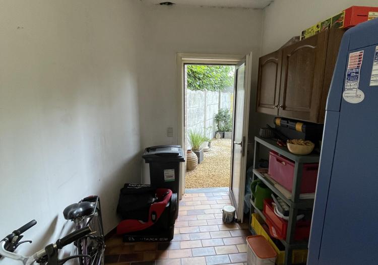 Op het gelijkvloers bevindt zich een inpandige garage met een autostaanplaats voor de garage, technische ruimte, voldoende berging en een tuintje.